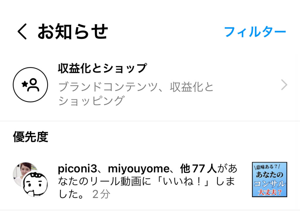 フォロワーが万垢超えている人からいいねなどくると、「優先度」という表記でお知らせがきます。(来なくてもいいけど、そういうインスタの仕様です。)