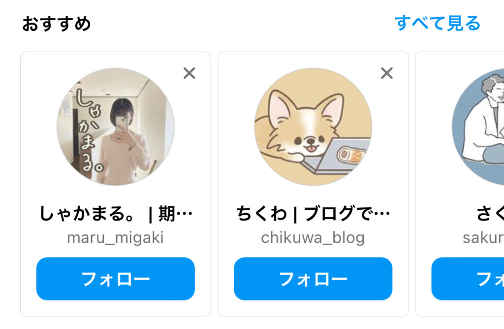 自分のアカウントを別垢で見て、他のおすすめを見るとこんな感じになるけど