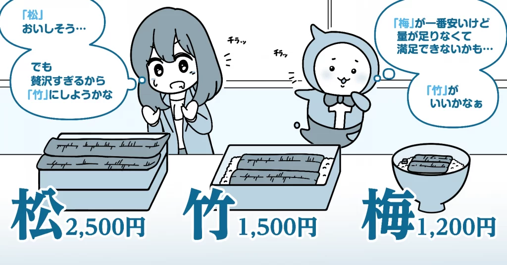 こんな感じに、真ん中の商品に自然と誘導するために、3つの商品を用意します。