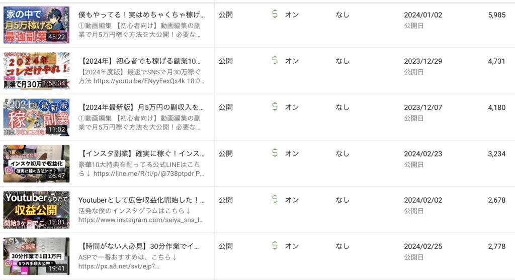 僕はまず、市場リサーチで、収益公開と検索して上位の動画のサムネイルを未漁りました。