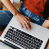 Close-up of hands typing on a laptop keyboard at a wooden table, perfect for remote work concepts.