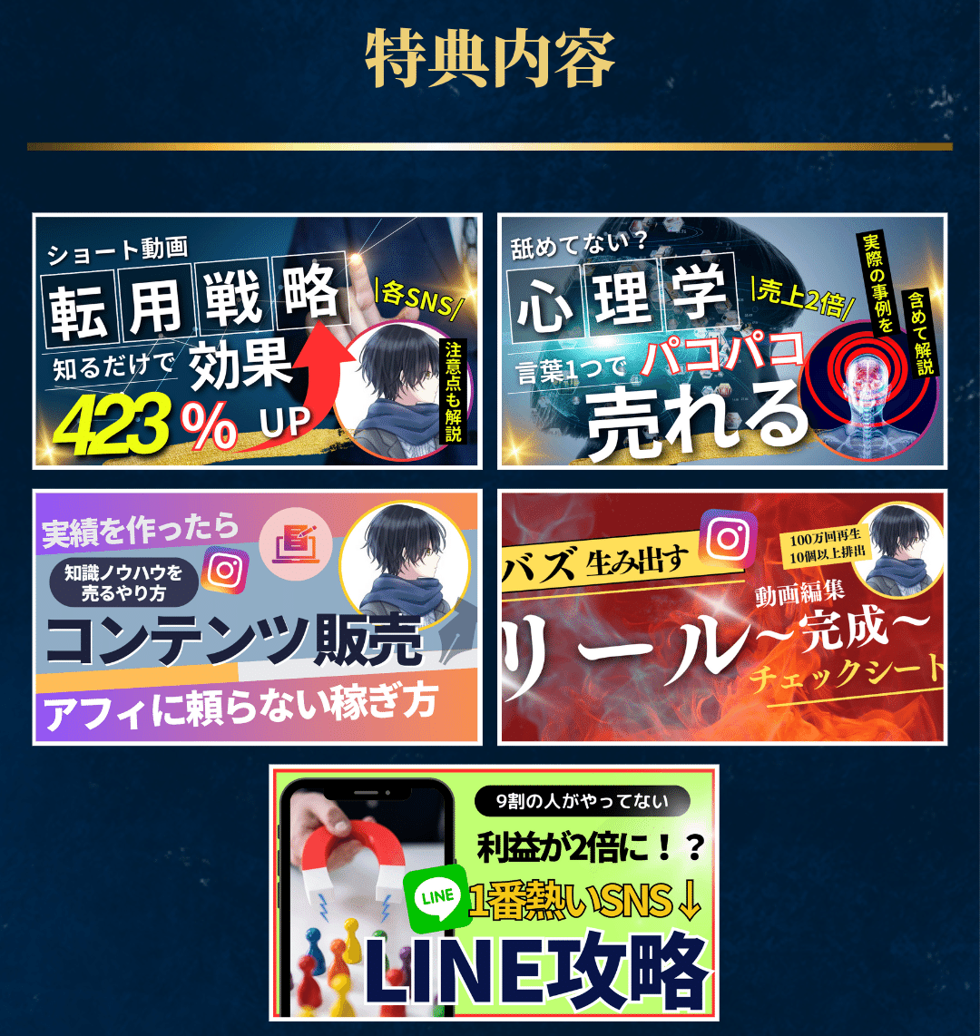 また、星5レビューしていただいた方には、限定で追加5大特典をご用意しております!↓