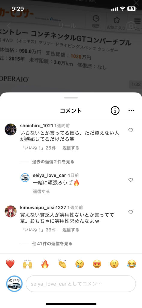 「庶民が買わない車」という冒頭により、買わないんじゃなくて買えない!というコメントが来るだろうと思って投稿したら。いらない。実用性ない。などのコメントが多く、妬みだろみたいなコメントから、議論が発生したケース。