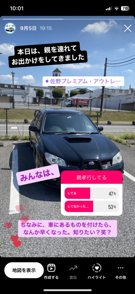 最初に、何気なく、車アカウントの方でこんなストーリーを上げました↓