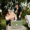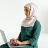 Smiling woman working remotely on a laptop in a stylish office setting.