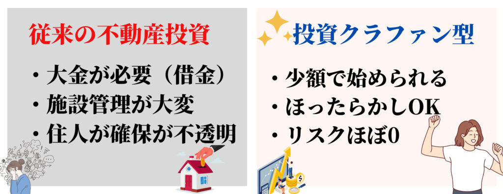 そんなニーズに対応して、今では1人で不動産投資をするのではなく、多くの人がお金を出し合ってするクラウドファンディング型になってきております!